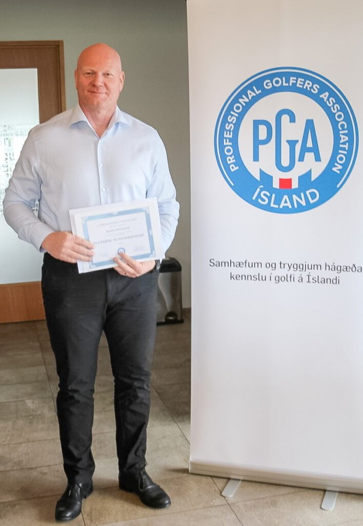 „Við störfum öll saman að því að efla golfíþróttina á Íslandi og er mikilvægt að við höldum áfram að þróa samtöl og verkefni í takt við þarfirnar. Tækifæri til útbreiðslu og uppbyggingar utan höfuðborgarinnar eru gríðarleg og ekki síst mikilvæg til framtíðar. Þannig þurfum við að sjá fyrir okkur hvernig við getum byggt upp þekkingu um land allt og fjölgað þeim sem þekkingu og áhuga hafa. Þannig hefur Golfsambandið ásamt PGA hvatt nemendur utan af landi til að sækja styrki sem bjóðast og þannig hefur Golfsambandið ásamt PGA einnig boðið upp á Golfdaga víðsvegar um landið. Það stendur til að halda því verkefni áfram og styrkja það enn betur. Tilgangur slíkra verkefna er ekki bara að kynna íþróttina fyrir börnum og unglingum, heldur að finna áhugasama á staðnum, styðja við þekkingu þeirra og bjóða stuðning svo hægt sé að byggja upp öflugra starf í þágu nýliðunar og fjölgunar á svæðunum. Þar getið þið verið lykilfólk í stöðunni. Ég hvet ykkur sem útskrifuðust hér í dag að leggjast á árarnar að ná hlutfalli barna og unglinga með okkur í 20% fyrir árið 2027. Slíkt er mælikvarði á árangur, uppbyggingu og gæðaþjálfun sem viðheldur nýliðunum og skapar þannig framtíðar kylfinga klúbbanna.“