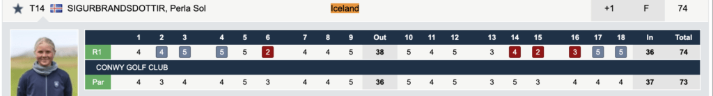 Perla Sól Sigurbrandsdóttir, nýliðinn í kvennalandsliðinu, lék best í dag af íslenska liðinu eða á 74 höggum +1 en Perla Sól er aðeins 15 ára og verður 16 ára í haust. Hún gæti verið á meðal keppenda á Evrópumóti stúlknalandsliða sem fram fer á Urriðavelli þessa dagana.