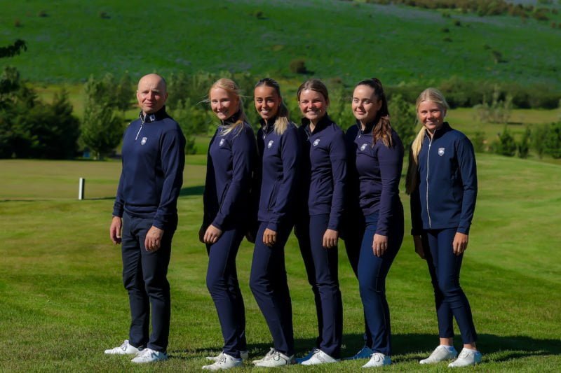 Íslenska kvennalandsliðið er þannig skipað: Heiðar Davíð Bragason liðsstjóri, Jóhanna Lea Lúðvíksdóttir, Saga Traustadóttir, Hulda Clara Gestsdóttir, Heiðrún Anna Hlynsdóttir, Perla Sól Sigurbrandsdóttir. Á myndina vantar Andreu Bergsdóttur. Mynd/seth@golf.is
