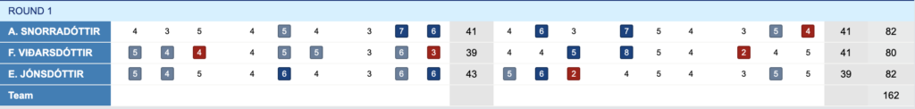 Eftir fyrsta hring mótsins var lið Keilis í 15. sæti, á átján höggum yfir pari. Fjóla Margrét lék á 80 höggum en Anna og Elva léku báðar á 82 höggum.
