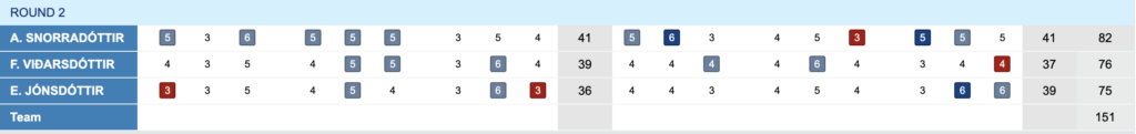 Annar hringurinn reyndist sá besti hjá liði Keilis. Þar voru þær jafnar með þriðja besta skor dagsins, upp á sjö högg yfir pari. Elva María lék þar best, á 75 höggum, Fjóla Margrét lék á 76 höggum og Anna Sólveig á 82 höggum. Með árangrinum stukku þær upp í 11. sæti mótsins.