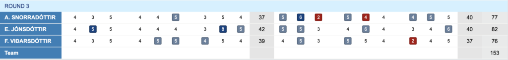 Þriðja hringinn lék íslenska liðið einnig vel og skiluðu inn skori upp á níu högg yfir par. Fjóla Margrét lék á 76 höggum, Anna Sólveig á 77 höggum og Elva María á 82 höggum. Tólfta sætið raunin.