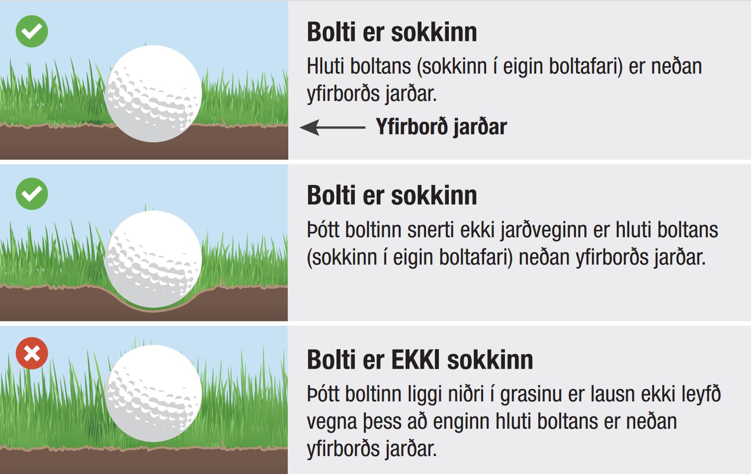 Til að boltinn teljist sokkinn þarf hann að vera að einhverju marki fyrir neðan yfirborð jarðarinnar, ekki nægir að hann sé á kafi í gróðri.