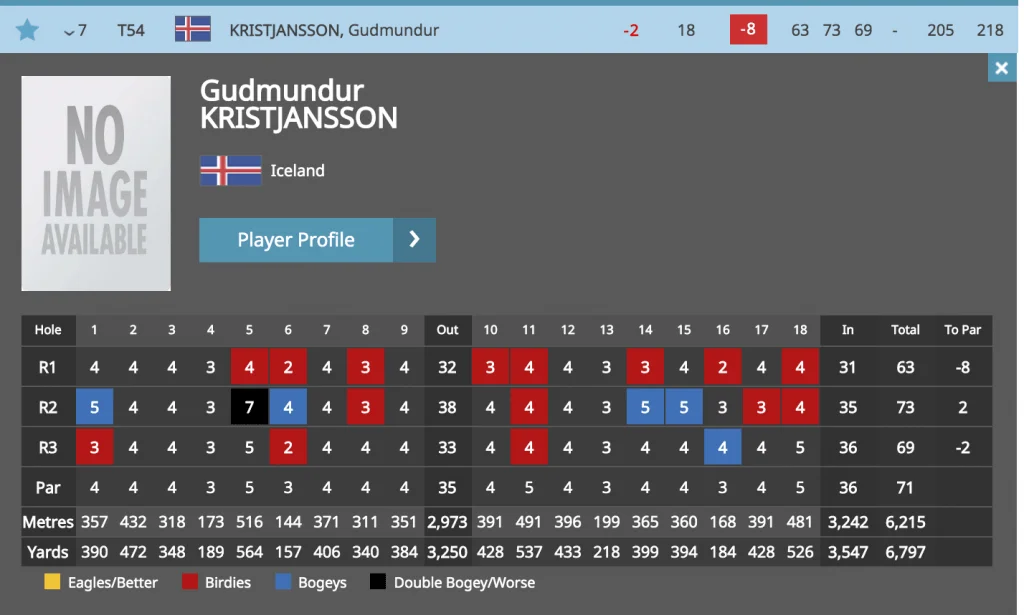 Guðmundur Ágúst hefur leikið fyrstu þrjá hringina á -8 samtals. Skorið á mótinu er mjög lágt og til marks um það þá er Guðmundur Ágúst í 54. sæti fyrir lokahringinn eins og staðan er núna.