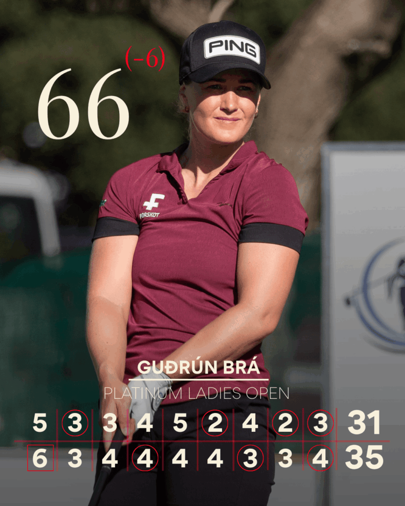 Guðrún Brá Björgvinsdóttir hefur leikið frábært golf síðustu daga á Platinum Ladies Open mótinu í Suður-Afríku. Að tveimur hringjum loknum situr ríkjandi Íslandsmeistarinn í sjötta sæti mótsins á níu höggum undir pari.