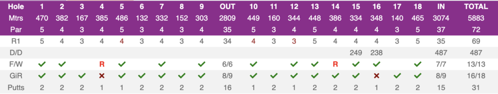 Guðrún lék fyrsta hringinn á 69 höggum, þremur undir pari vallarins. Hún fékk þar þrjá fugla og tapaði ekki höggi. Sláttur Guðrúnar hefur reynst henni dýrmætur í mótinu, en tölfræði mótaraðarinnar segir hana hafa slegið gífurlega vel. Samkvæmt Guðrúnu sjálfri hitti hún þó ekki allar brautir vallarins báða dagana líkt og tölfræði hennar gefur til kynna.