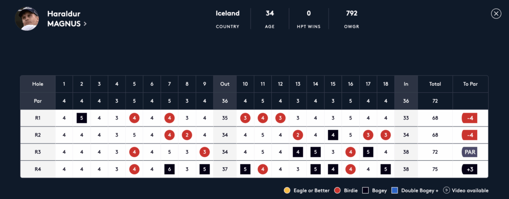 Síðasti hringur mótsins reyndist erfiður, en Haraldur kom í hús á 75 höggum, þremur yfir pari og endaði mótið jafn í 39. sætinu. Englendingurinn Will Enefer stóð uppi sem sigurvegari mótsins á fjórtán höggum undir pari.