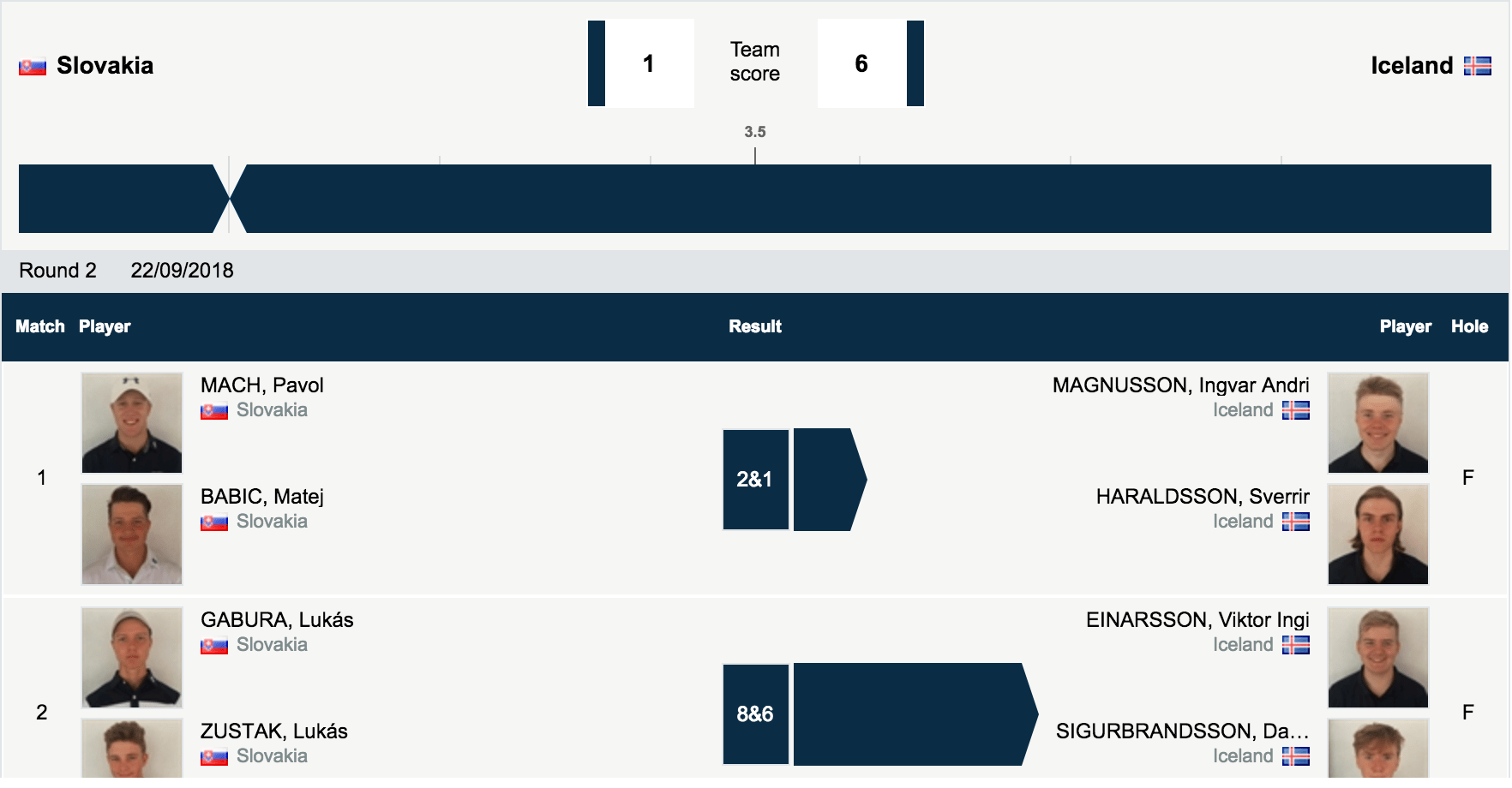 Íslenska liðið endaði í 2. sæti í höggleiknum á -9 samtals og leikur gegn liði Portúgals í undanúrslitum í A-riðli. Noregur sigraði með nokkrum yfirburðum í höggleikskeppninni á -16 samtals og leikur gegn Slóveníu í undanúrslitum.