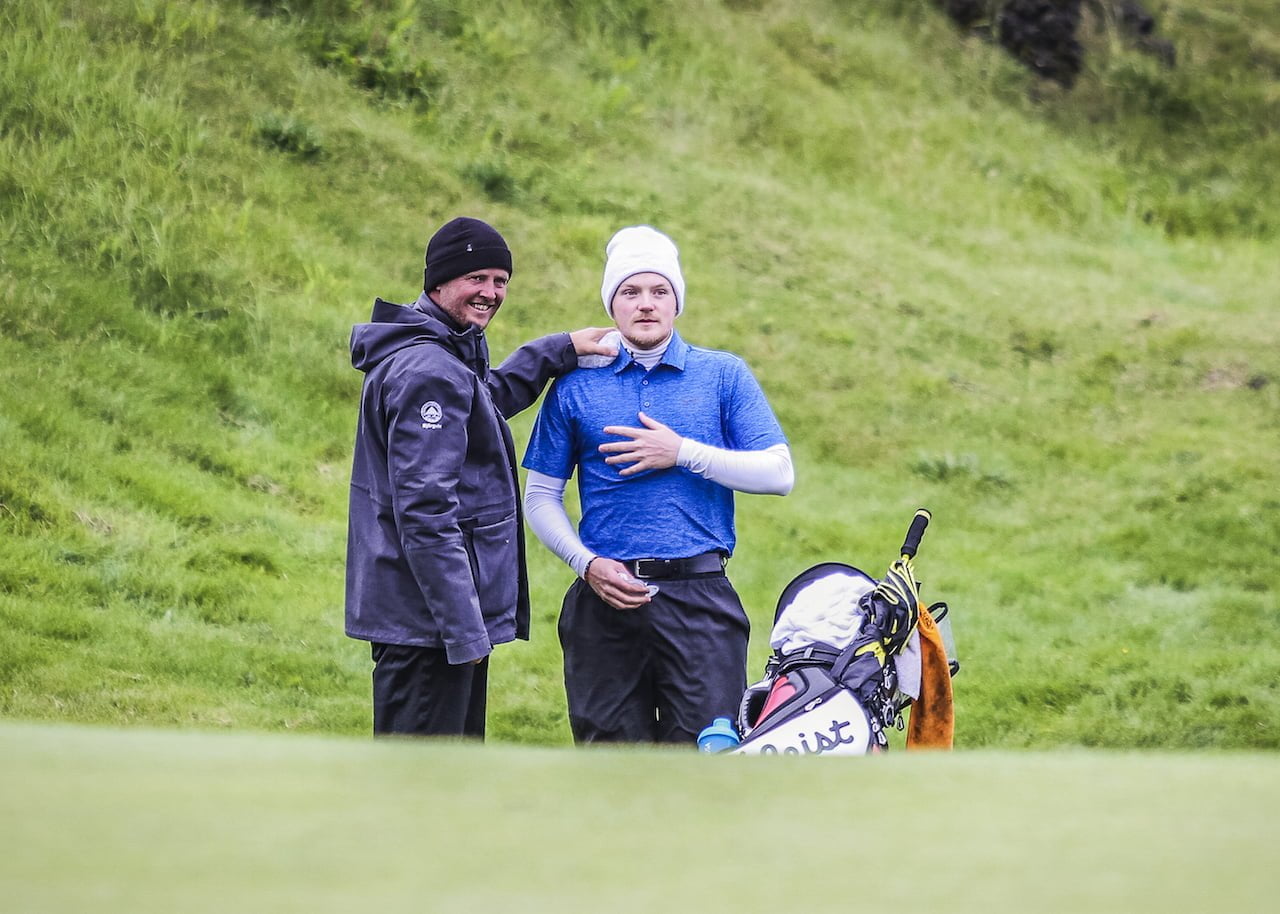 Sigurbrandur var með húfu á höfðinu og segir hann að það hafi bjargað miklu. Hann bar sig vel þegar golf.is ræddi við hann í morgun í Vestmannaeyjum og var klár í slaginn með syni sínum á öðrum keppnisdegi Íslandsmótsins í golfi.