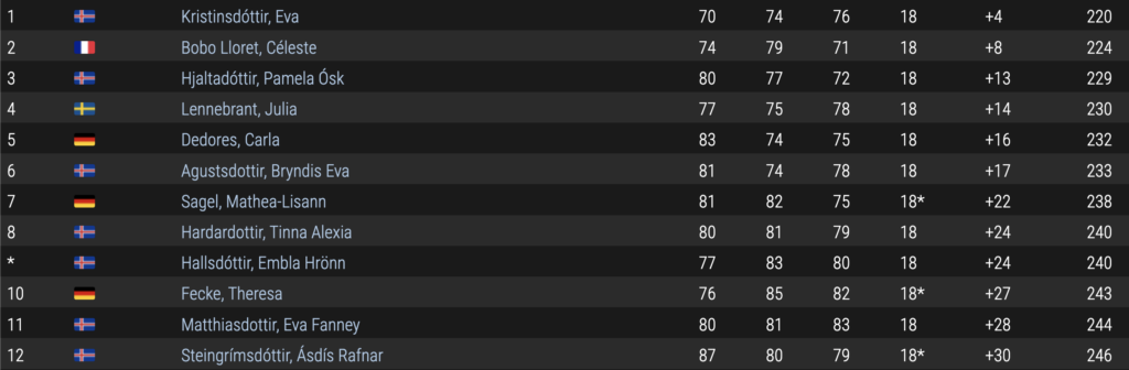 Eva Kristinsdóttir, GM, stóð uppi sem sigurvegari kvenna eftir flotta spilamennsku. Hún leiddi mótið frá fyrsta hring og lauk leik á fjórum höggum yfir pari í heildina. Eva lék hringina þrjá á 70-74-76 höggum og var fjórum höggum á undan hinni frönsku Céleste Bobo Lloret.