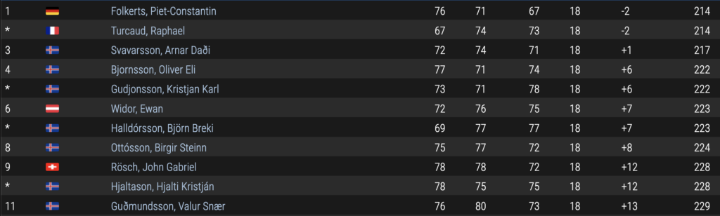Í karlaflokki var það Arnar Daði Svavarsson, GKG, sem lék best allra Íslendinga. Hann lék mótið á einu höggi yfir pari í heildina og endaði þriðji. Arnar endaði mótið af krafti og fékk tvo erni á síðustu fjórum holum lokahringsins.