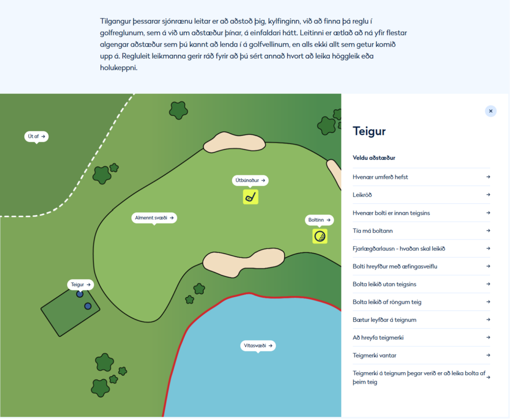 Allar golfreglurnar hafa verið þýddar á íslensku, ásamt skilgreiningum, skýringum, verklagi nefnda og regluleit leikmanna. Regluleit keikmanna hefur leyst af hólmi sérstaka leikmannaútgáfu reglnanna og er afar öflugt tæki til að fletta upp reglum. Þar velur leikmaður einfaldlega umhverfi eða atriði á yfirlitsmynd til að hefja leit.